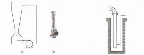 空氣提升泵(圖3-39)嚴格意義上來說并不是一種泵,因為其并沒有實現(xiàn)任何程度的速度和壓力的轉(zhuǎn)換?諝饣蚱渌麣怏w通人提升管底端并與液體混合,因氣液混合物密度
