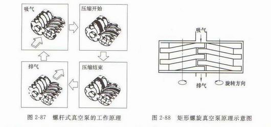 (2) 矩形螺旋式真空泵,它由矩形段面的右螺旋和左螺旋的一對轉(zhuǎn)子相嚙合,由同步齒輪帶動實現(xiàn)非接觸式的高速運轉(zhuǎn),氣體有上側(cè)進入,在泵腔內(nèi)壓縮,由轉(zhuǎn)子下端排除,轉(zhuǎn)子旋轉(zhuǎn)一周排氣一次。由于轉(zhuǎn)子和泵體內(nèi)形成一種螺旋密封結(jié)構(gòu),矩形斷面間隙泄露較少,加上它的螺旋圈數(shù)多,故可以得到比螺桿式泵較高的壓縮比。這種泵可以從105Pa 抽到極限壓力10-1Pa,通常抽速為40-80m3/h.。矩形螺旋真空泵原理示意圖如圖2-88所示。