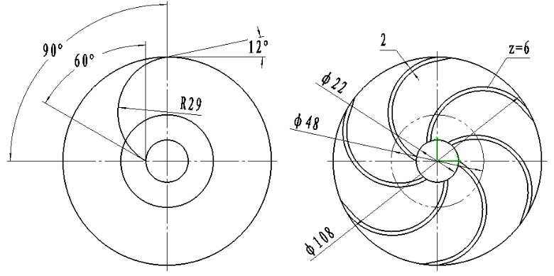 根據(jù)導(dǎo)葉片座標(biāo)圖和裝配圖上的導(dǎo)流殼軸面圖,就可以畫(huà)出導(dǎo)流殼零件圖了。如圖2-10所示。你們可能注意到,在畫(huà)這個(gè)葉片時(shí),沒(méi)有用方格網(wǎng)設(shè)計(jì),這是我把它簡(jiǎn)化了,簡(jiǎn)化是有條件的,這就是流面基本是平面,這個(gè)導(dǎo)流殼的上下流線(xiàn)都在平面內(nèi),所以就可以不通過(guò)方格網(wǎng)而直接作圖了。既然是在平面上作圖,那就是真實(shí)的葉片安放角,為什么要說(shuō)是簡(jiǎn)化畫(huà)法呢,那是因?yàn)榱骶(xiàn)還有一小部分是在曲面上,在曲面上的葉片安放角就只有通過(guò)方格網(wǎng)來(lái)測(cè)量了,當(dāng)然也可以在立體圖中進(jìn)行測(cè)量,比如現(xiàn)在標(biāo)注的出口安放角60度就不是真實(shí)的出口安放角,你們可以畫(huà)立體圖進(jìn)行測(cè)量,估計(jì)在70度左右。QJ型井用潛水泵(深井泵)